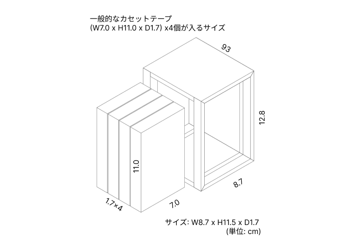 *一般的なカセットテープ, 7.0×11.5×1.7(cm)×4個が余裕をもって入るサイズ