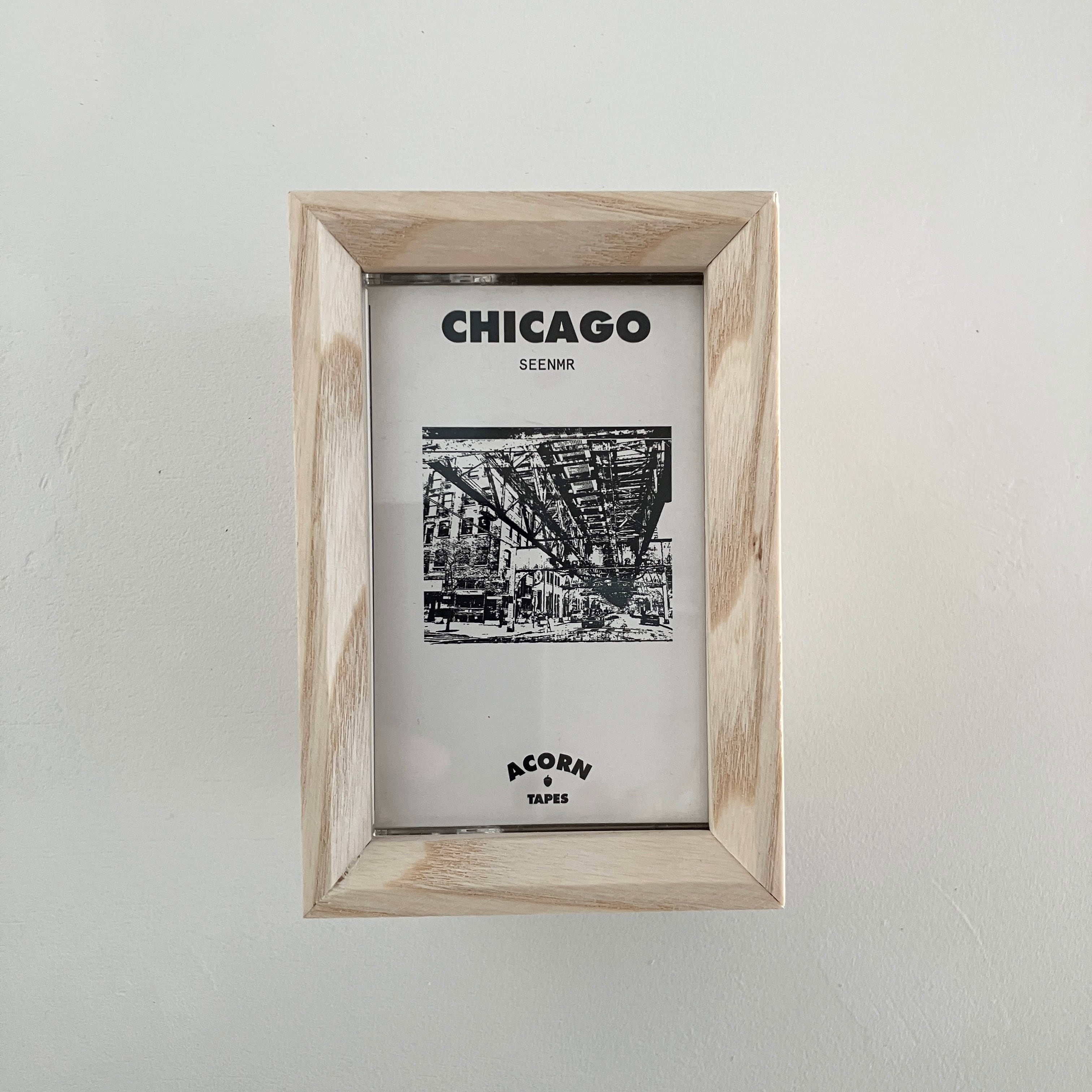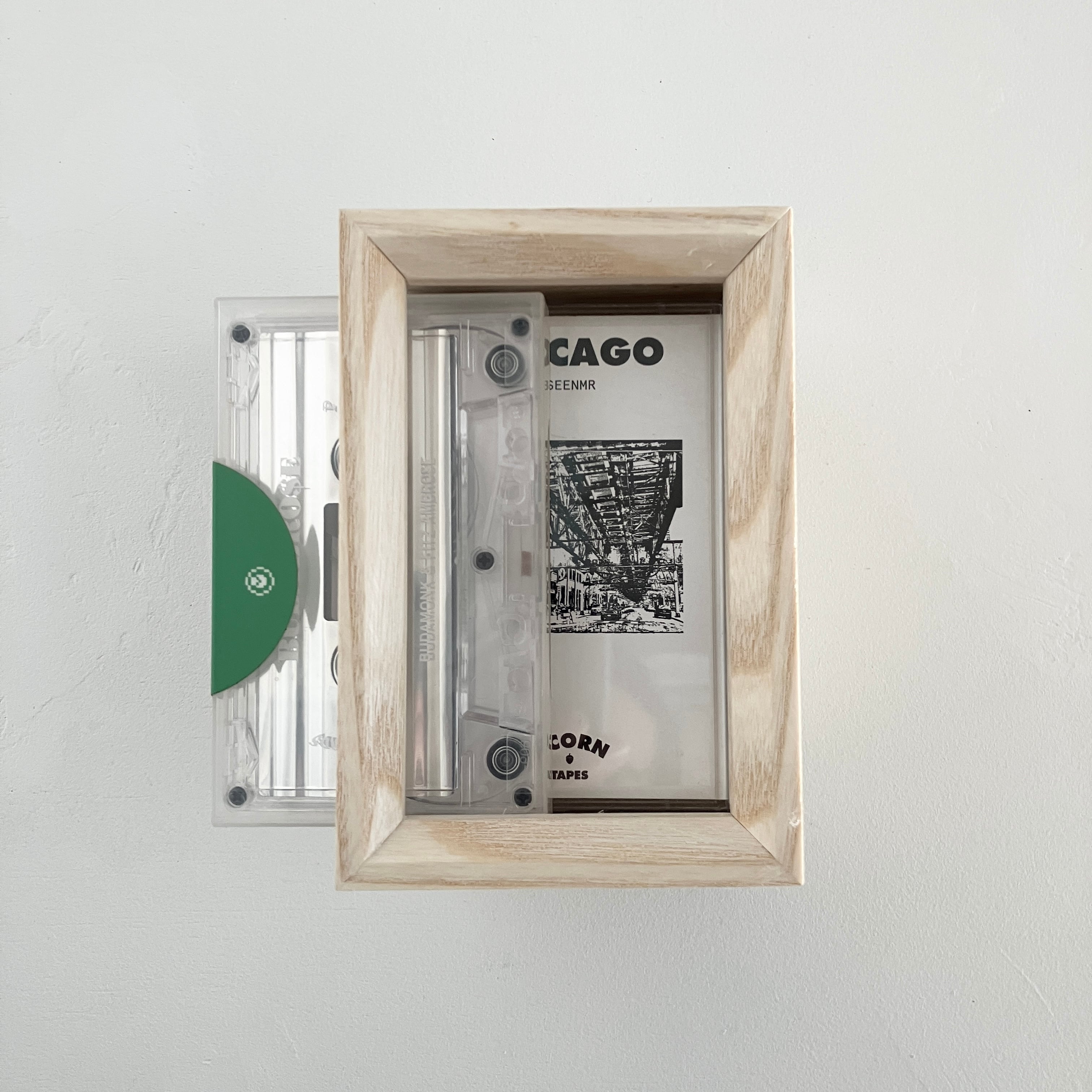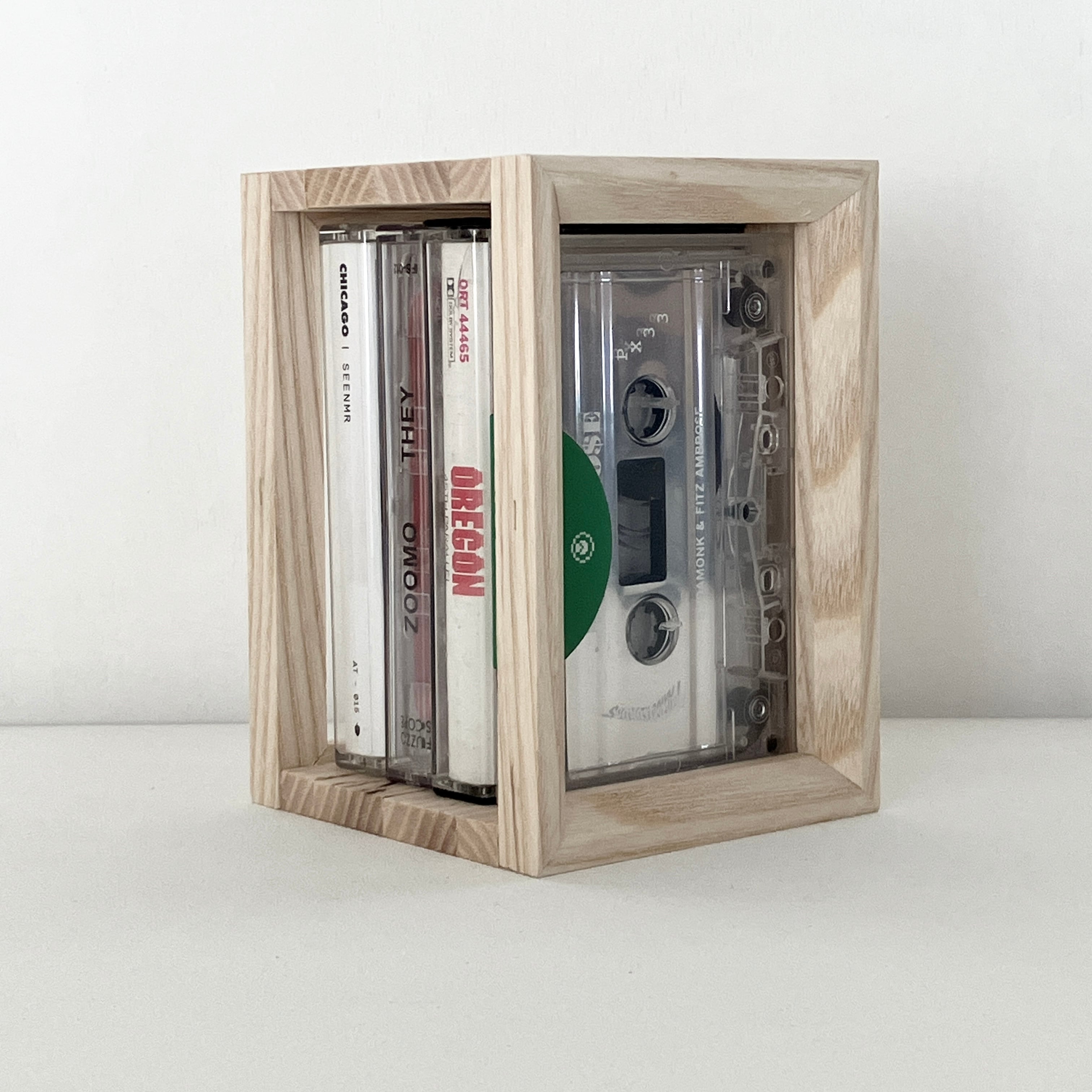 音の印象の一つであるカセットケースを置いてよく見えるように、そして次第に馴染んでいく木のフレーム。