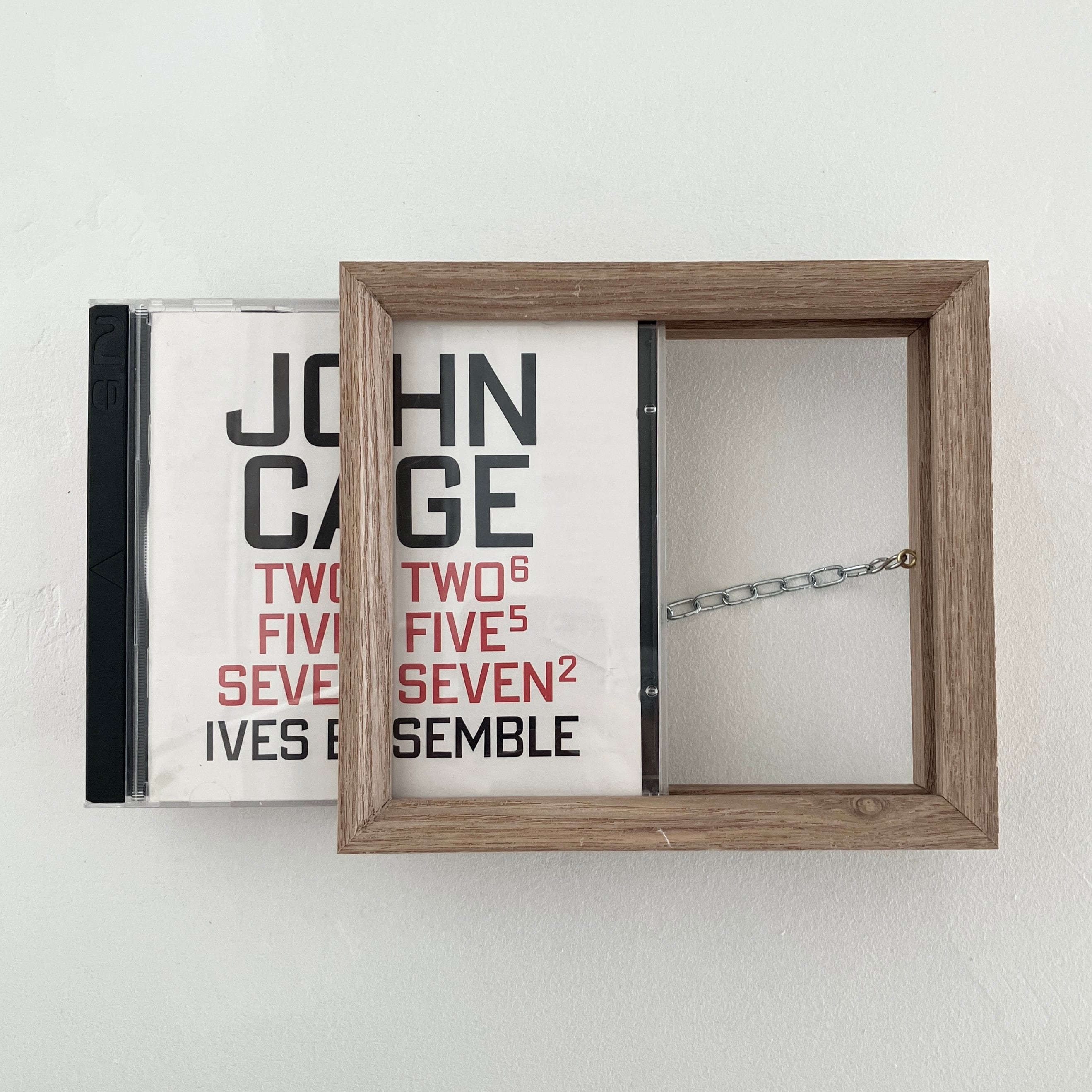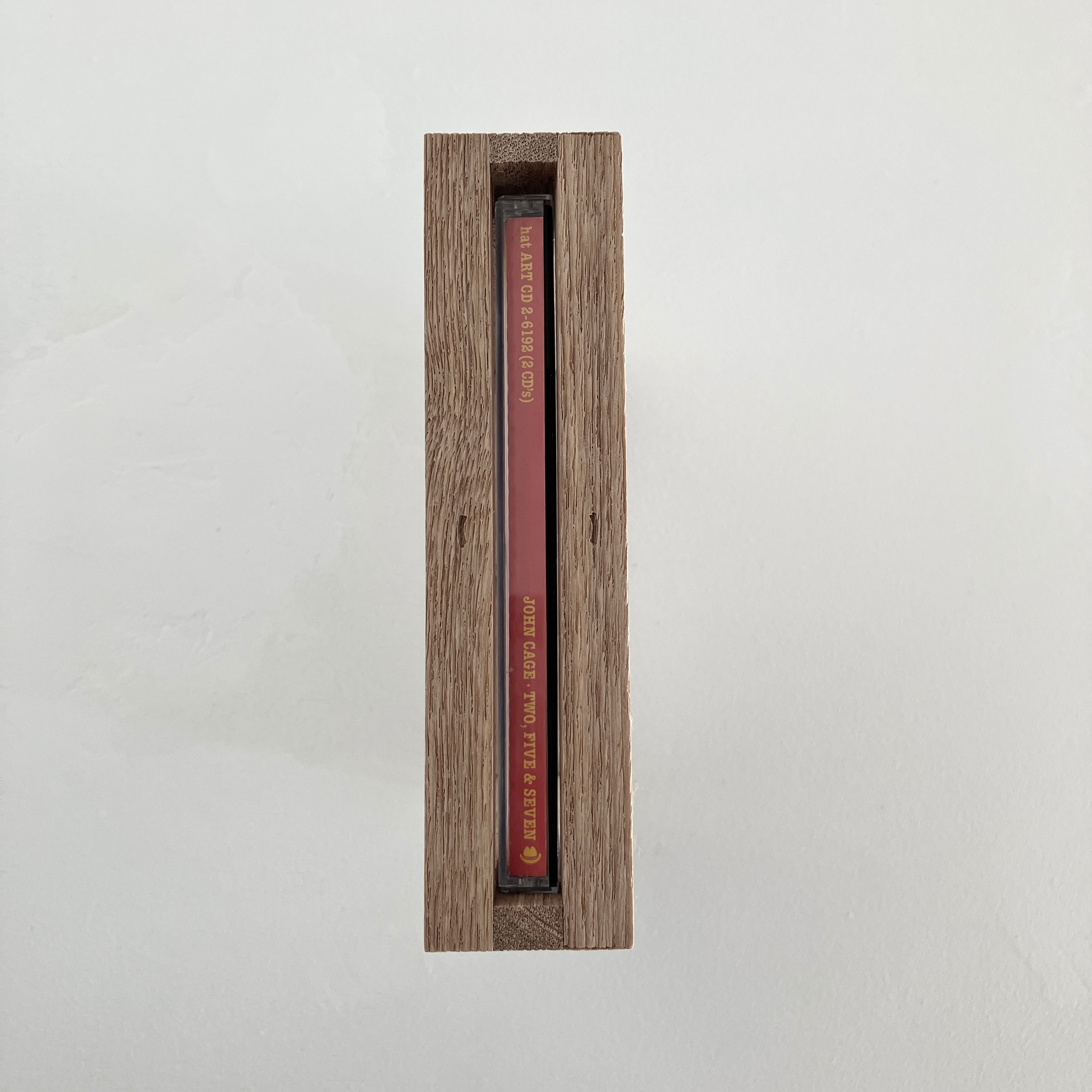 音の印象の一つであるCDケースを壁掛け、または置いてよく見えるように、そして次第に馴染んでいく木のフレーム。